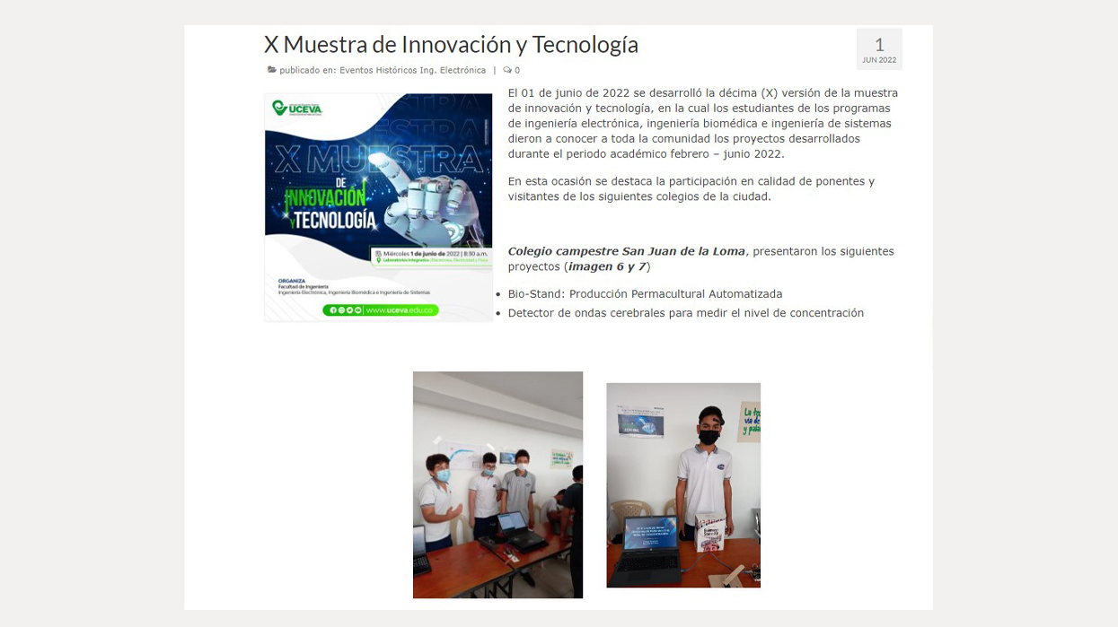 El viernes 11 de noviembre se llevó a cabo la IX carrera naval promovida por la faculta de ingeniería de la UCEVA en la cual el colegio Campestre San Juan de la Loma fue el campeón en la categoría avanzada.